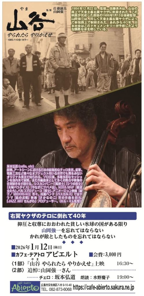 『山谷 やられたらやりかえせ』上映&山岡強一さん追悼Live [坂本弘道(cello) 朗読:水野慶子] 1月12日@広島 cafe・teatro Abierto